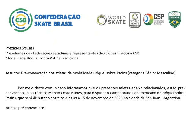 Seleção Brasileira Sênior Masculina é pré-convocada para o Pan-Americano de Hóquei sobre Patins