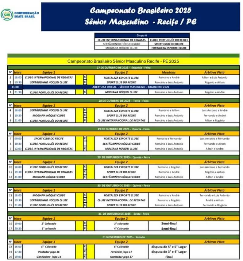 A fase classificatória será disputada entre os dias 27 e 30 de outubro, com jogos diários a partir das 18 horas. As semifinais estão marcadas para sexta-feira, 31 de outubro, e as finais para sábado, 1º de novembro, quando serão definidas as posições de 5º e 6º lugar, 3º e 4º lugar, além do grande campeão brasileiro de 2025.